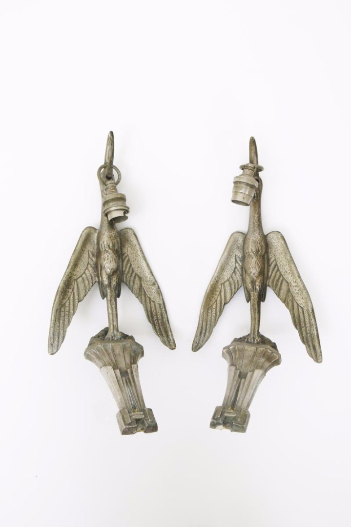 A pair of Art Deco silvered metal wall applique in the manner of Albert Cheuret, each modelled as a bird flying before a cornucopia, with later glass shades unmarked, 24cm. deep, 23cm. high (2)