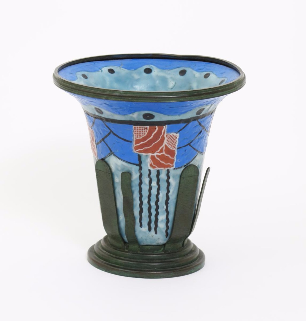 A bronze mounted enamel vase by A Vilpien, flaring cylindrical form, enamelled with geometric flowers in red, black and white on a blue and grey ground, with loose bronze foot with vertical columns, painted A Vilpien signature 25cm. high