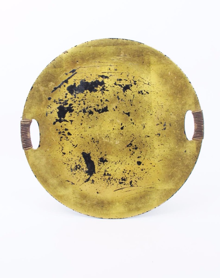 A lacquered wood tray the design in the manner of Jean Dunand, the circular tray with carved and cane finished handles, covered in a golden lacquer unsigned 49cm. diam.