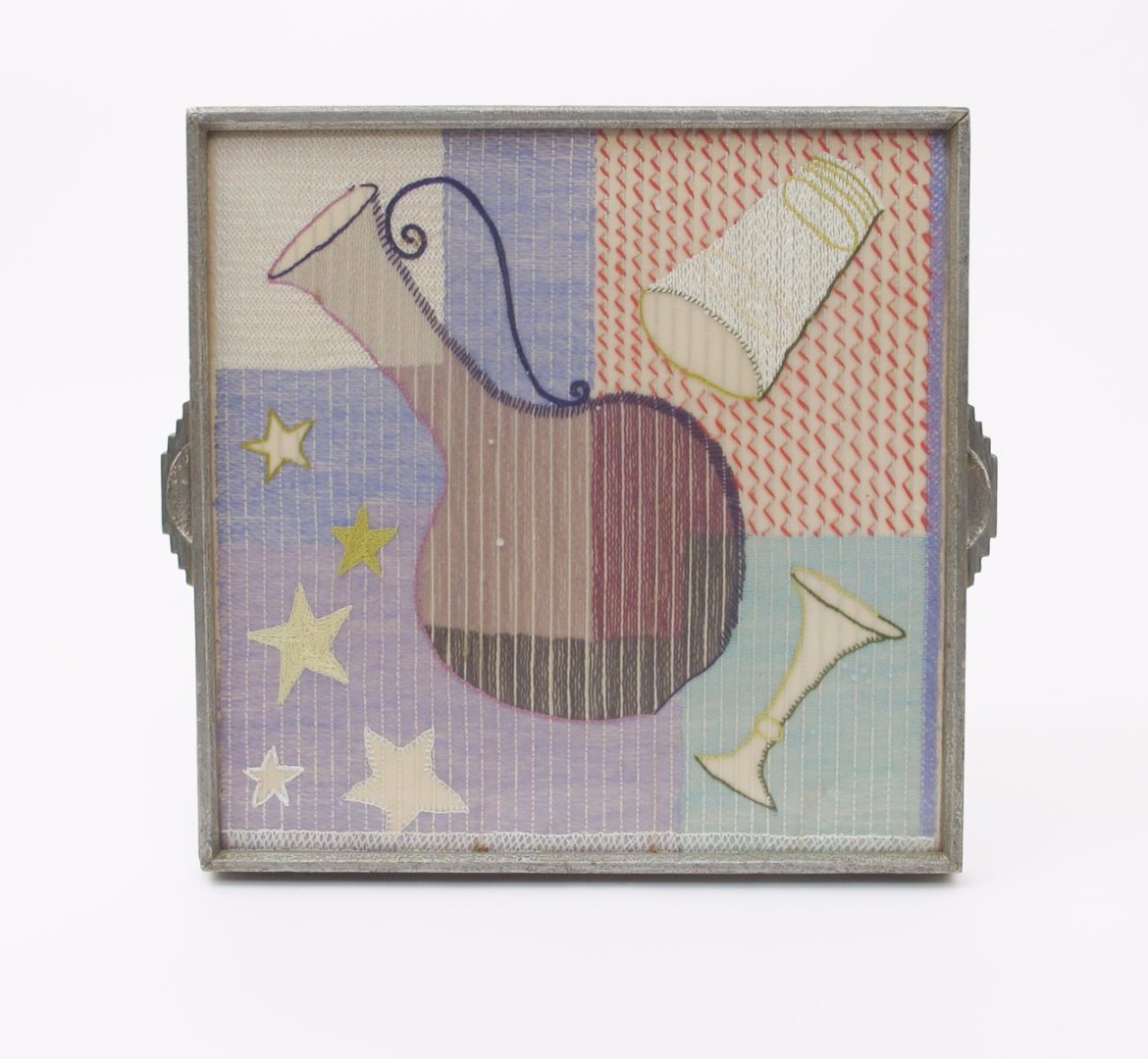 A Rowley Gallery embroidered tray, square section, embroidered with a carafe and drinking vessels, in coloured silk threads, glazed and with silvered wooden frame and stepped handles, applied Rowley stamp 40cm wide.