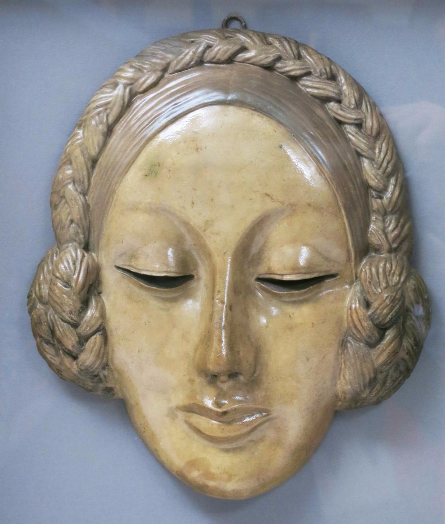 An Art Deco verdi patinated metal wall mask cast from a model by Professor Severino Tremator, (1895-1940), covered in a cream patination, framed, unsigned 26cm. high