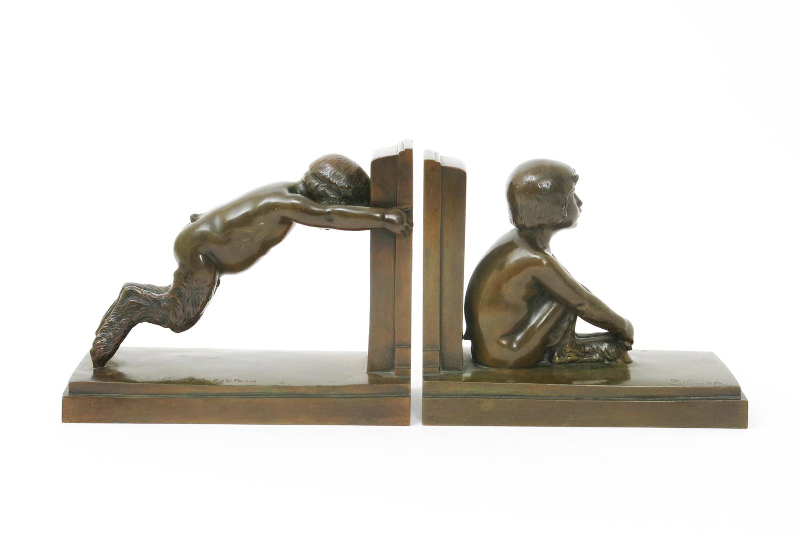 A pair of patinated bronze book ends modelled as a satyr cast from a model by Paul Silvestre, one seated and resting the other pushing at a wall, signed in the cast and Suisse Fres foundry mark, 23cm. wide