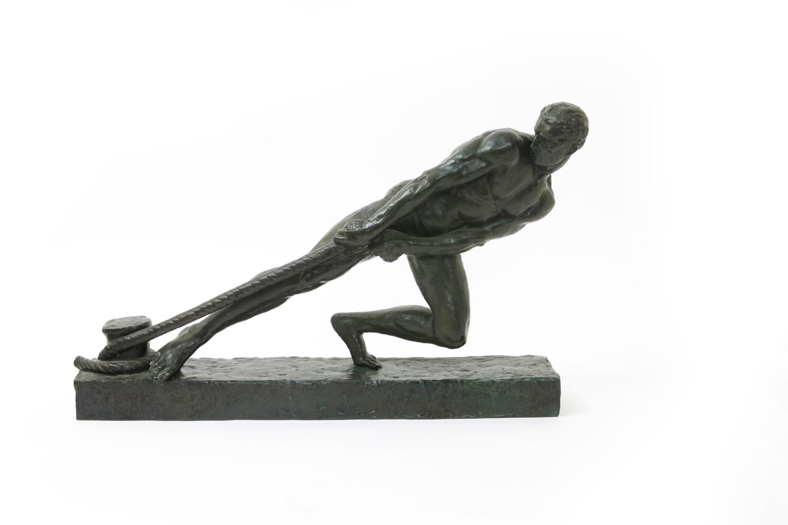 a patinated bronze cast from a model by Pierre Le Faguays, modelled as a muscular male athlete pulling a rope taught signed in the cast P Le Faguays 70cm. wide