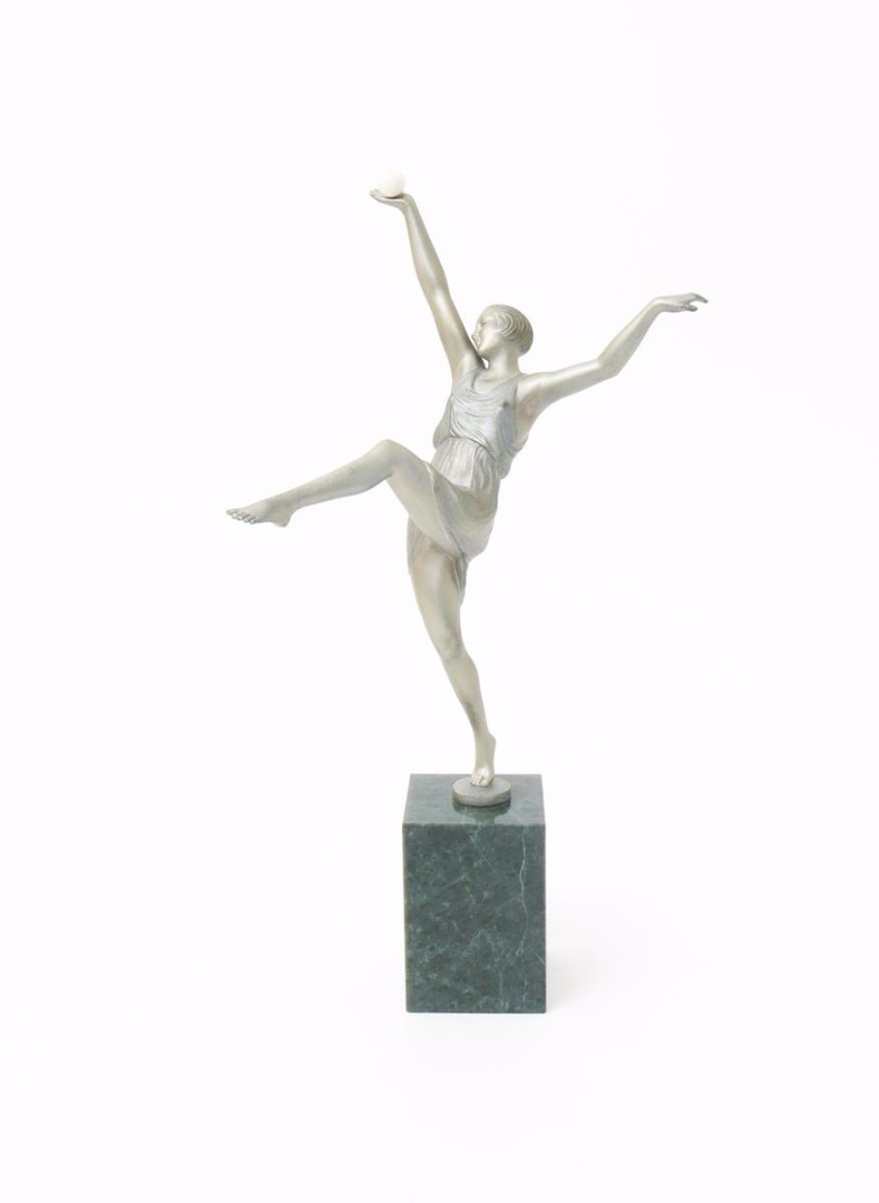 'Girl with a Ball' an Art Deco patinated bronze model of a dancer cast from a model by Pierre Le Faguays, modelled holding an ivory ball, covered in a silvered patination, on green and black marble base, signed P Laurel in the base, stamped foundry mark, 41cm. high