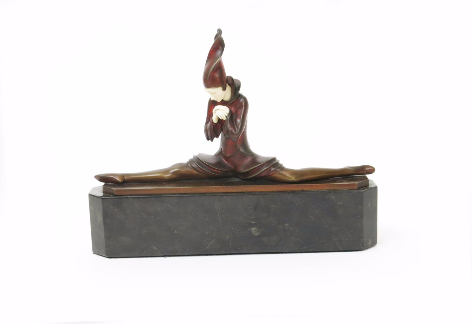 Le Grande Escart Respecteux (The Respectful Splits) a rare bronze and ivory figure of a dancer cast from a model by Paul Phillipe, modelled gracefully holding the splits pose, on polished black marble base, signed with R & M foundry mark in the cast 28cm wide, 21.5cm. high