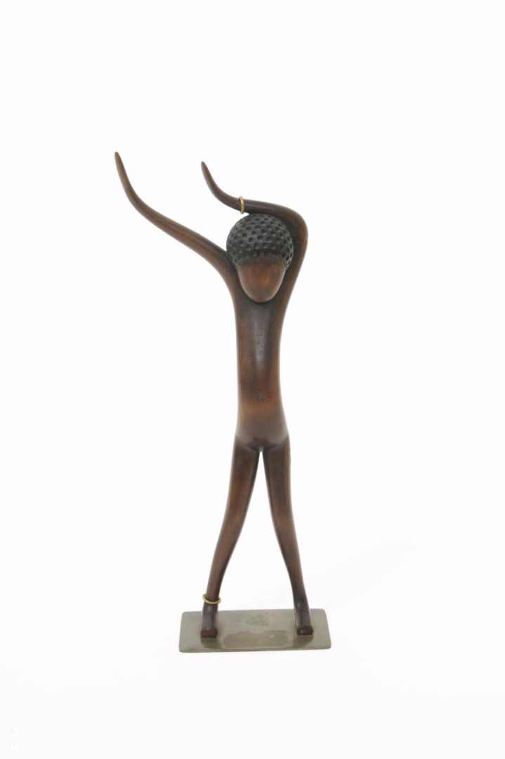 A Hagenauer wood and bronze model of a boy, modelled with arms raised wearing bracelet and anklet on rectangular bronze base, stamped marks to base 28cm. high