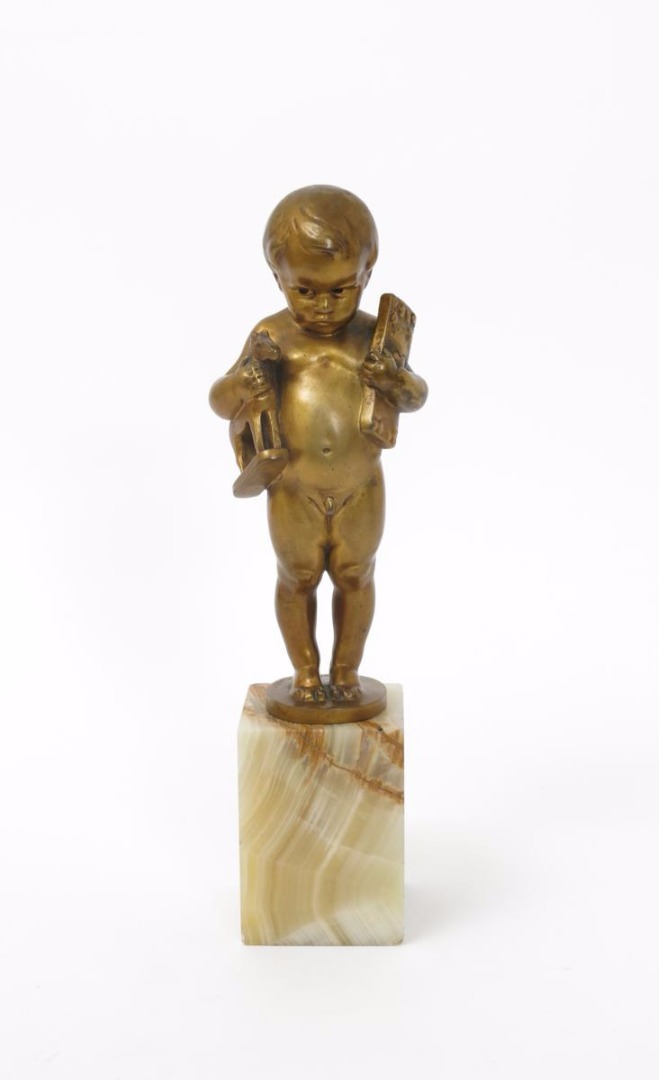 A gilt bronze model of a young boy cast from a model by Eugene Wagner, dated 1910, modelled standing holding a toy horse and a panel, on veined onyx base signed in the cast Eug Wagner, dated 1910, 37cm. high