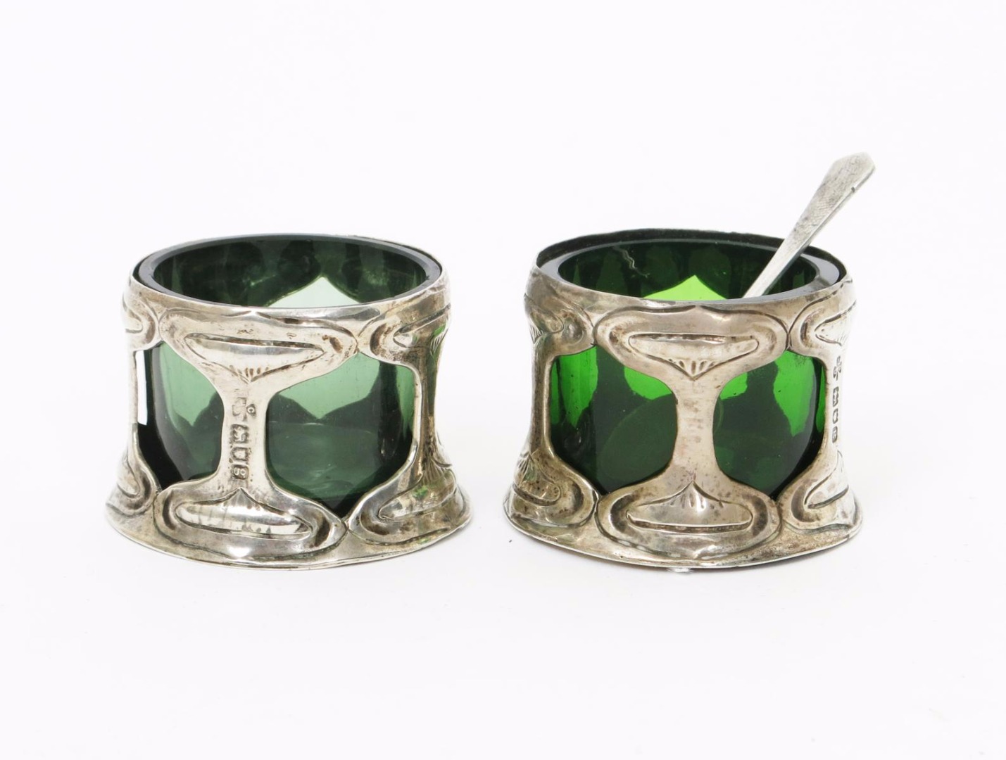 A pair of George Lawrence Connell silver salts, each pierced and cast with stylised foliage panels, with original green glass liners, and a matched serving spoon, stamped mark, London 1902, 4cm. high