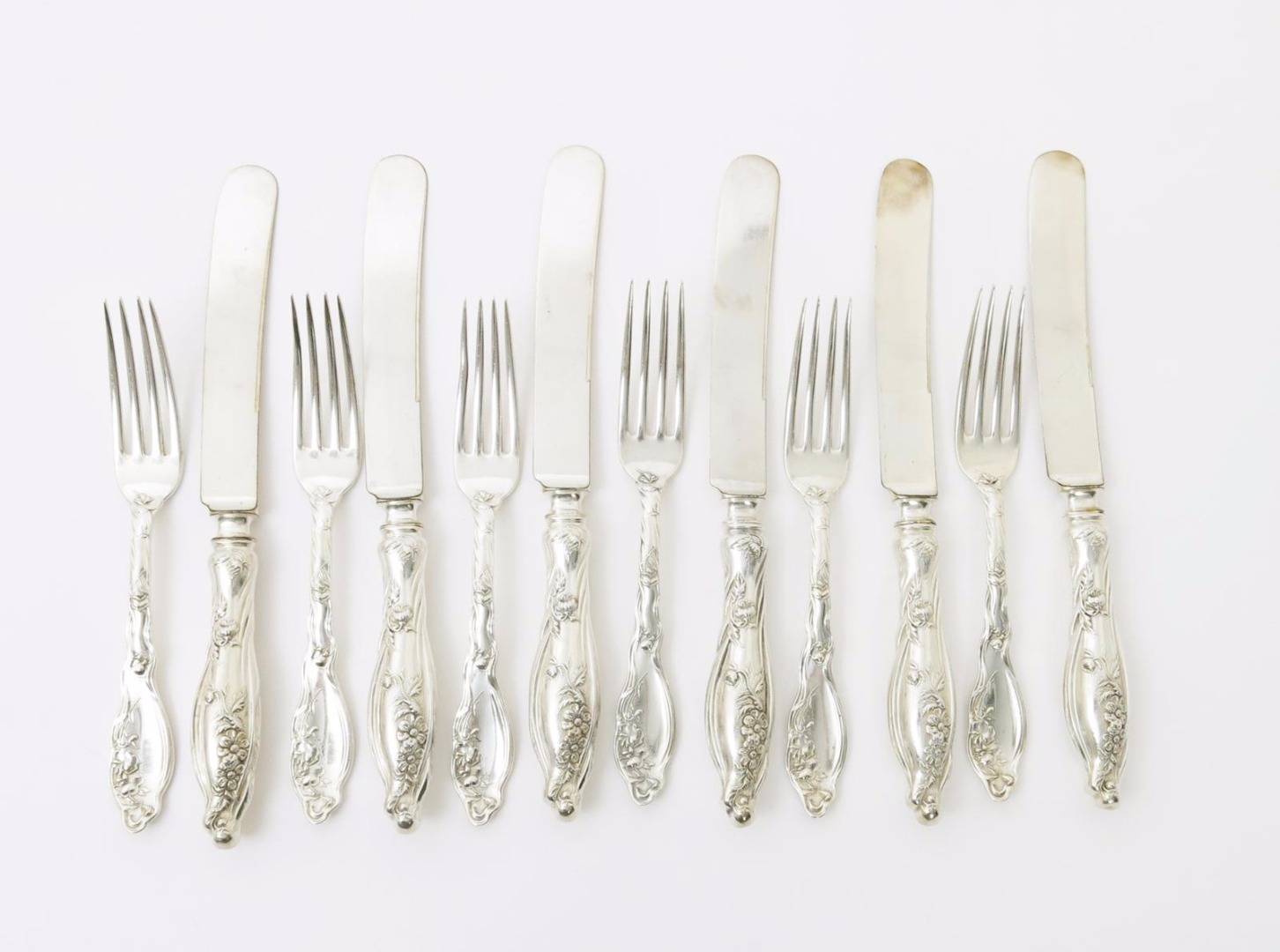 Six Aesthetic Movement silver dinner knives and forks, the handles cast in low relief with simple flower sprays stamped Sterling to forks, 25cm. long (knives), (12)