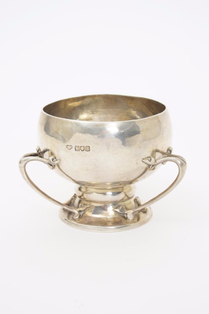 A Goldsmith's & Silversmith's silver footed cup, with three applied loop handles, hammered finish, London 1906 10cm. high