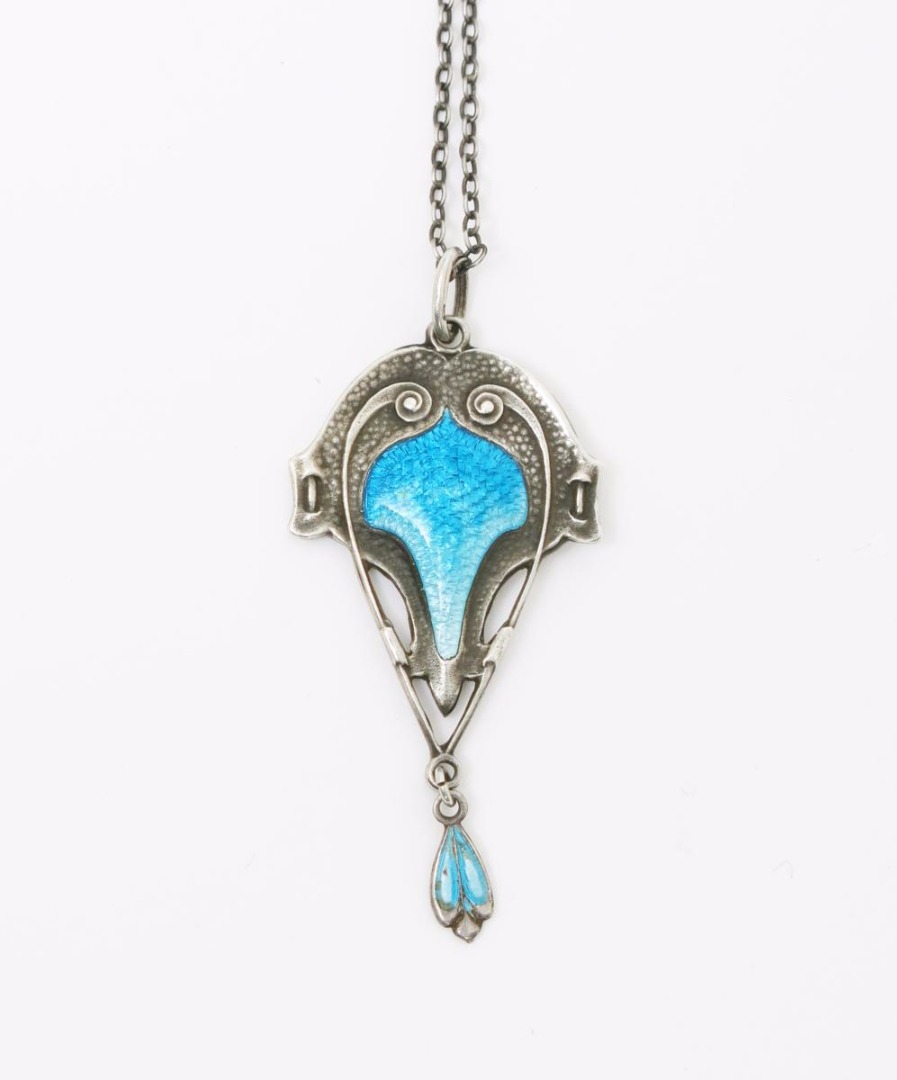 A James Fenton silver and enamel pendant necklace, shield shape with smaller foliate drop, enamelled in pale blue stamped marks, Birmingham 1908, 4.5cm. long