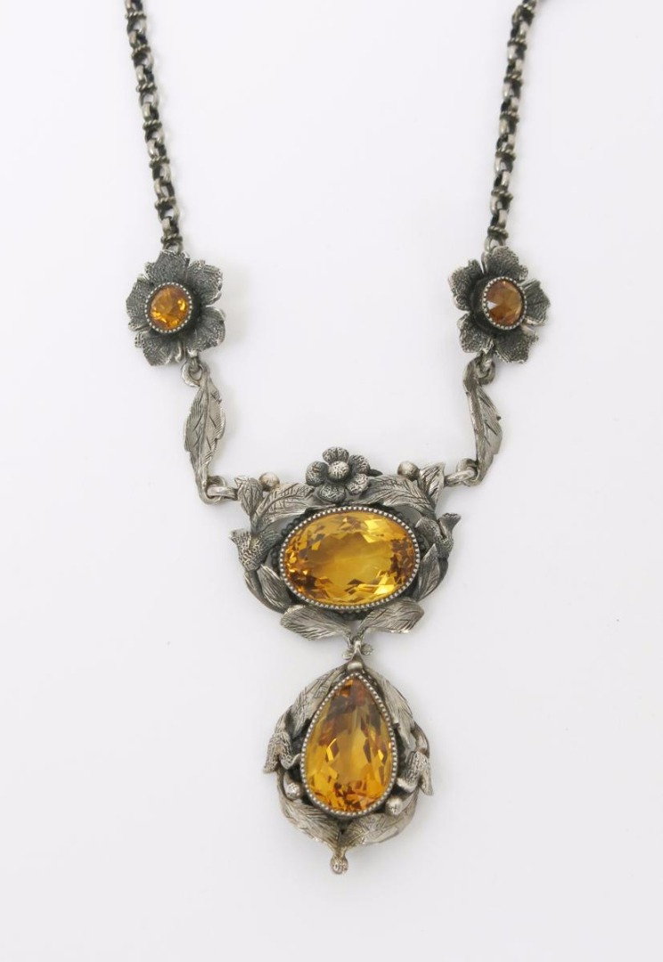 A continental silver and citrine set necklace, cast foliate frame set with central citrine, with similar drop, the chain set with two similar flowerhead panels unsigned 4.5cm. long