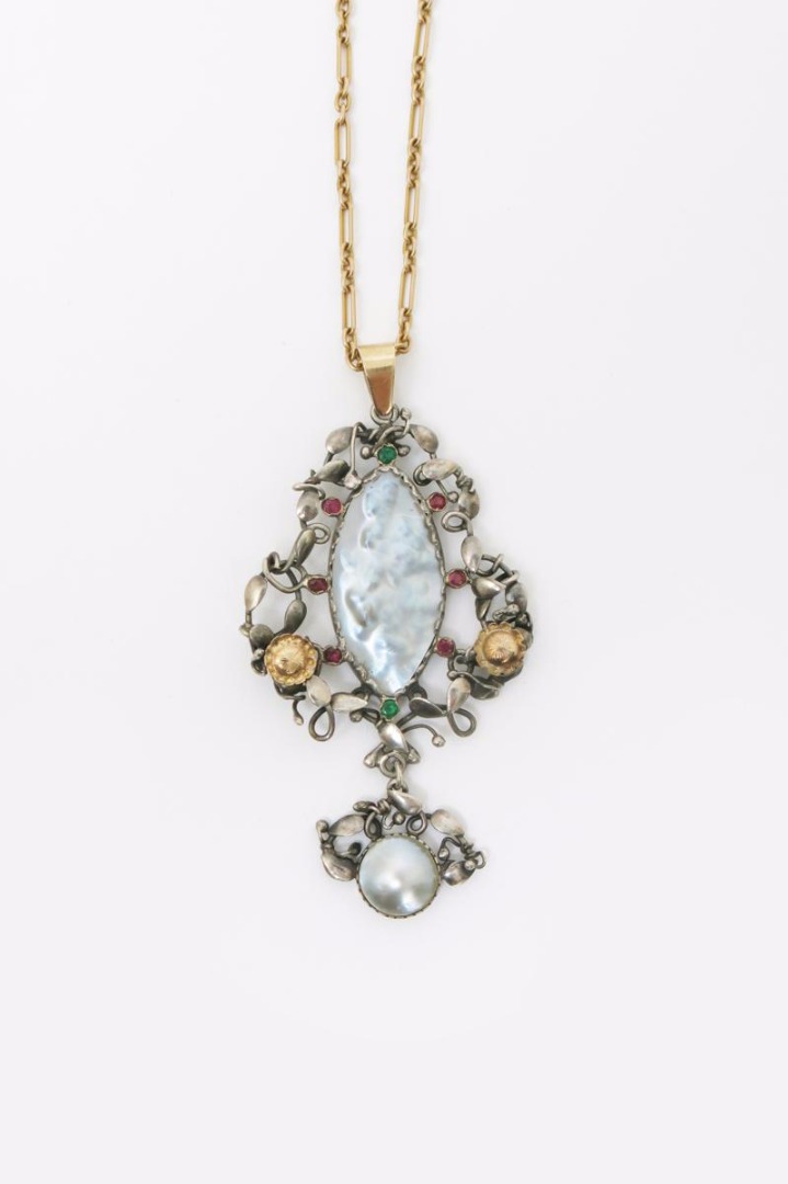 A silver pendant necklace in the manner of A.H. Jones, the wirework foliate frame set with yellow metal flowers, abalone shell panel and an abalone shell drop, set with peridot and ruby stones, unmarked, 7cm. long
