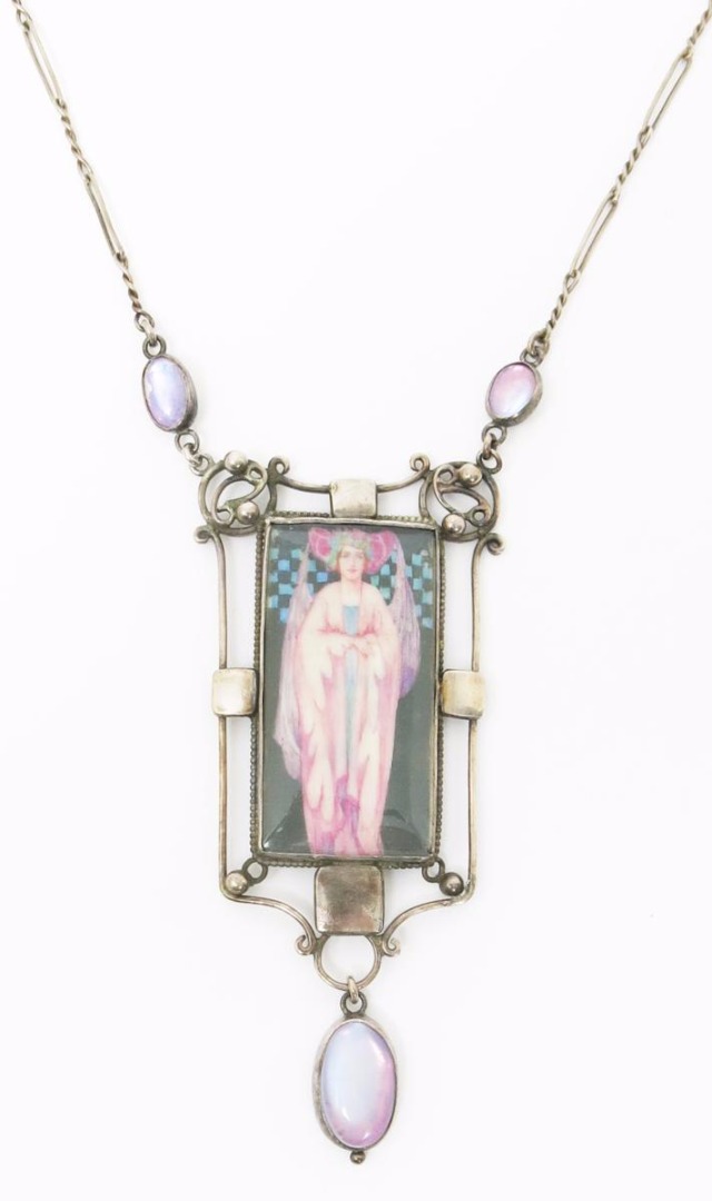 An Arts and Crafts silver necklace in the manner of R.C. Price, the wirework frame set with central rectangular painted panel of a female saint possibly by Averil Burleigh, set with amethyst drop, the wirework link necklace with panels and amethysts unsigned 9cm. high