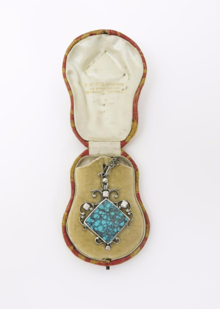 A silver and turquoise mounted pendant necklace by Beatrix Cameron, the thick metal frame set with square turquoise stone, inside scroll borders, in fitted presentation case from Beatrix Cameron, pendant unsigned, case signed Beatrice Cameron 102 Mount Street, Grosvenor Square, 6cm. long