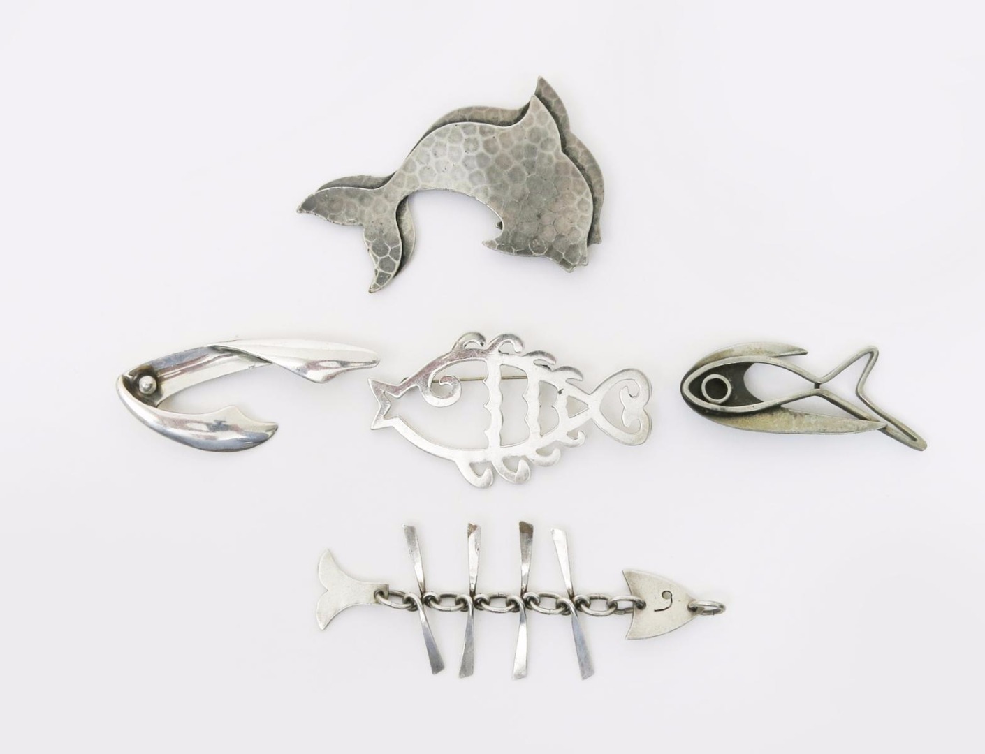 A Mexican silver Los Castillo fish brooch by Sigi Pineda, stylised form, another Mexican silver fish brooch, a skeletal fish pendant and two other stylised fish brooches, stamped marks, 6.5cm. wide (5)