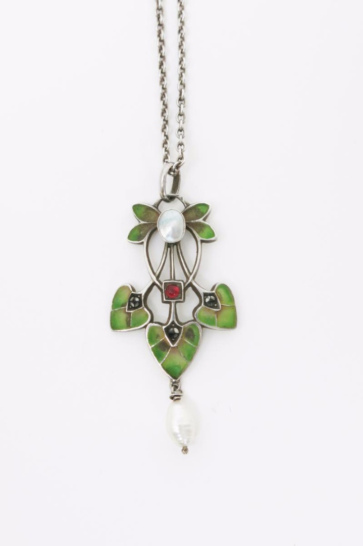 An Art Nouveau Levinger & Kissinger silver and plique a jour enamel necklace, cast as three foliate panels, enamelled in green, set with central garnet, mother of pearl panel and natural pearl drop, stamped depose to reverse 5cm. high