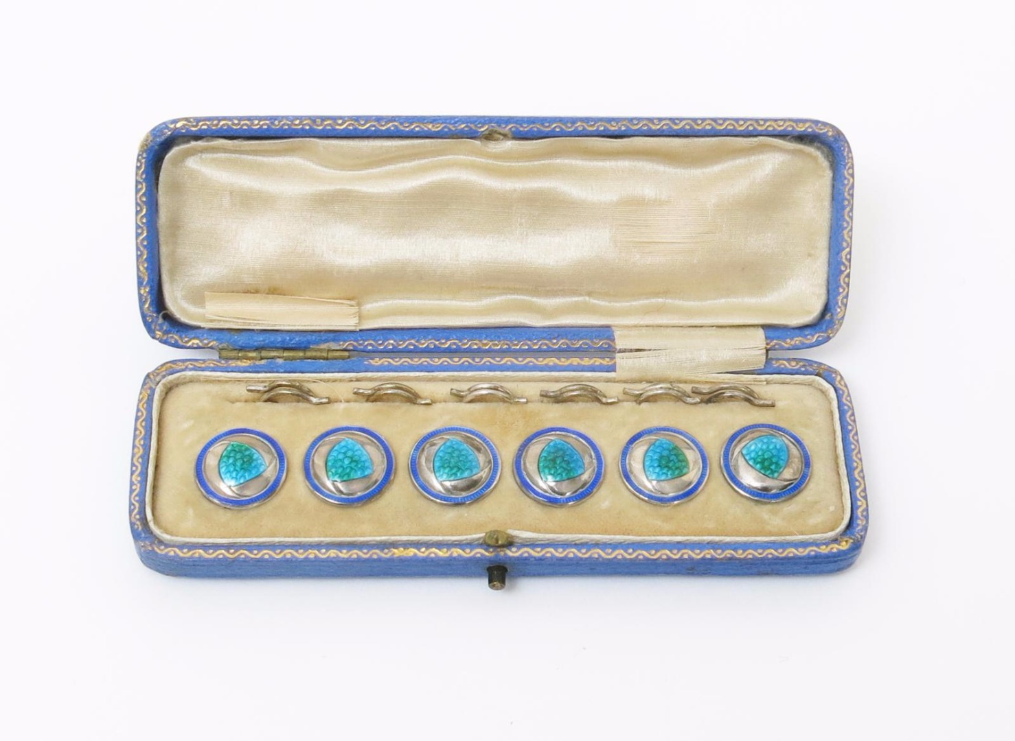 A set of six James Fenton silver and enamel dress buttons, in original fitted case, circular, cast in low relief and enamelled in shades of blue and green stamped marks, Birmingham 1908, 1cm. wide.