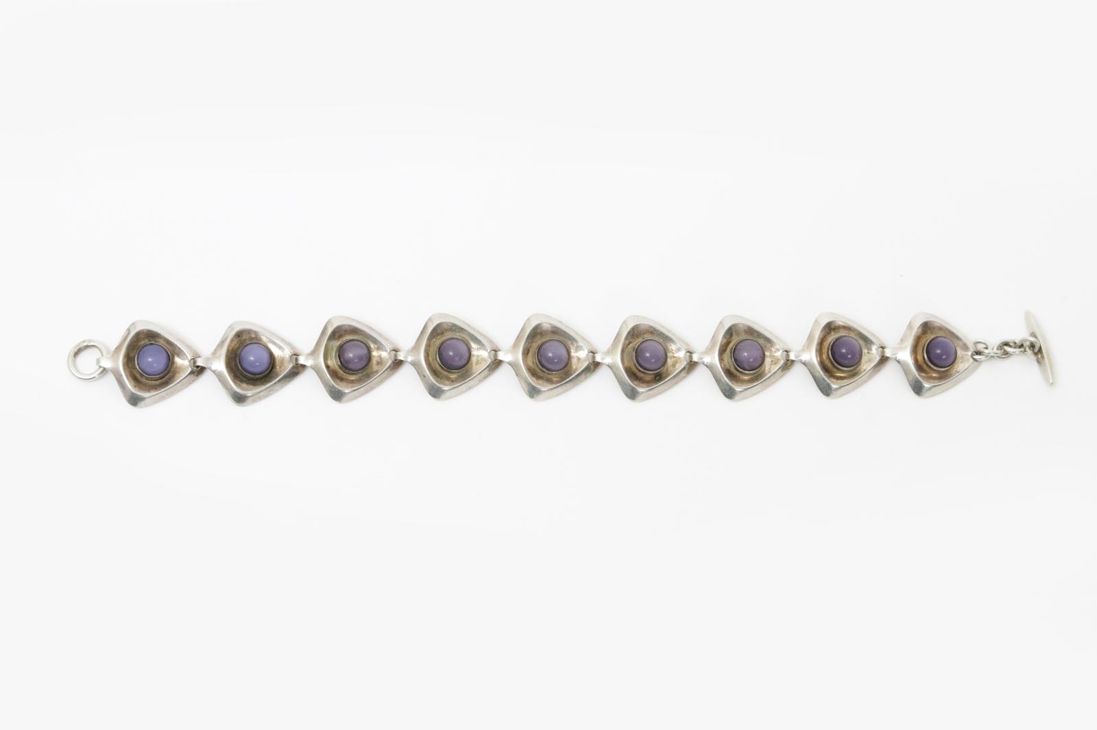 A Danish silver link bracelet by Herman Siersbol, the cast triangular sections set with amethyst stones, stamped 925S HS to bar, 18cm. wide.