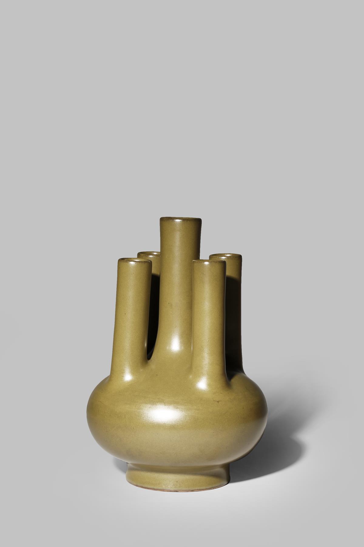 A RARE CHINESE TEA-DUST GLAZED VASE 18TH CENTURY With five cylindrical necks rising from a...