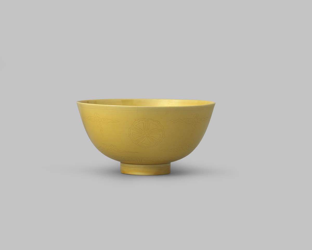 The U-shaped body with a gently flaring rim, incised to the exterior with four medallions divided by clouds, all above a band of lappets to the foot, the interior with a fifth medallion enclosed within a double ring, decorated all over with a yellow glaze, the base glazed white, a paper label for Bluett & Sons London, 12cm.
