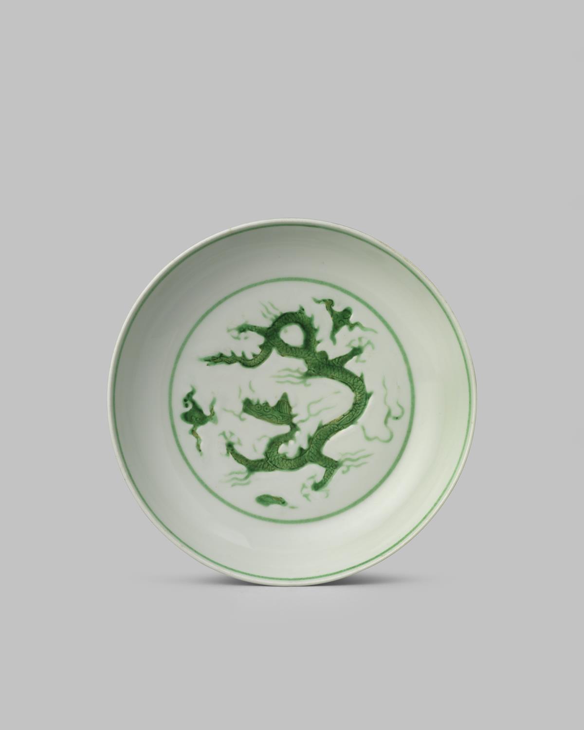 A RARE CHINESE IMPERIAL GREEN ENAMELLED 'DRAGON' DISH