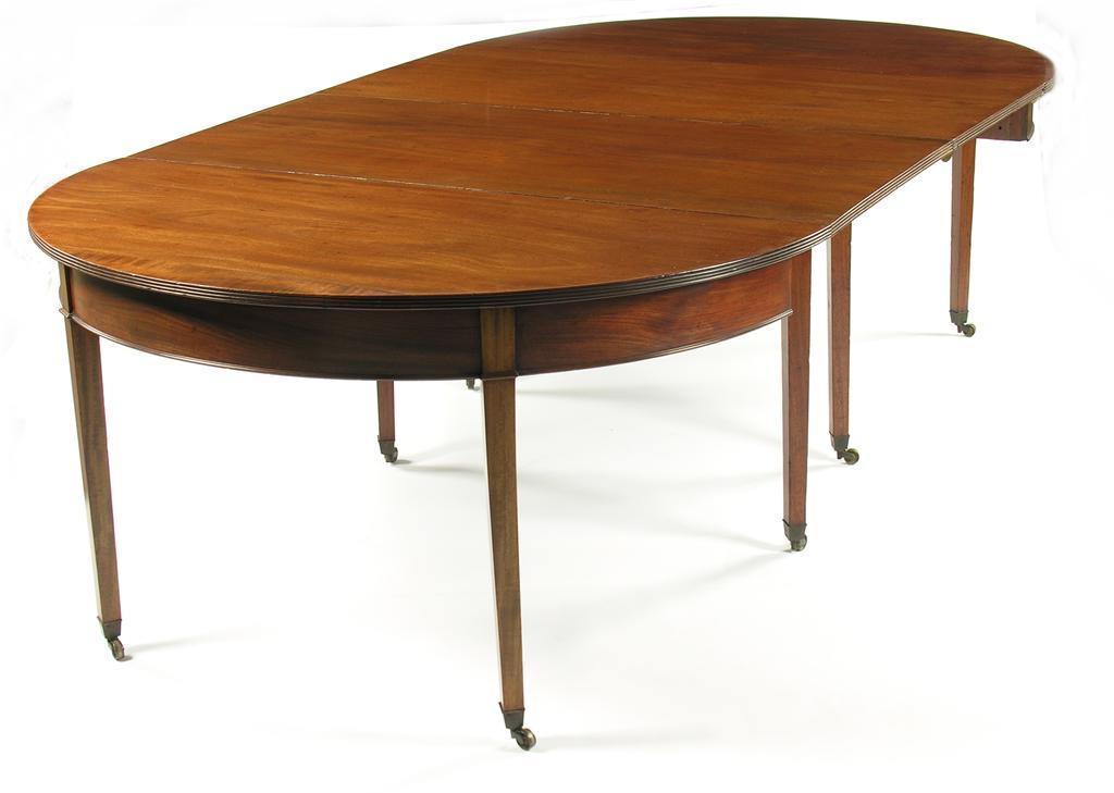 A 19th century mahogany dining table, the pair of 'D' ends on twin gates with a reeded edge top and two extra leaves, the frieze with an applied moulding on square tapering legs to brass castors, 28.5in (72.3cm) h, 101in (256.5cm) extended, 54in (137cm) w.