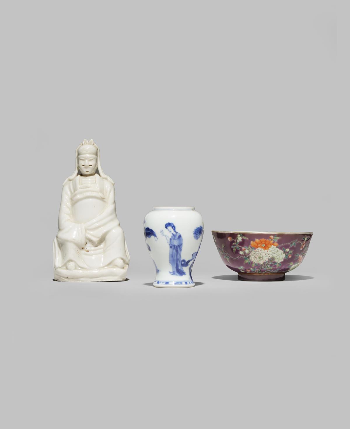 Decorated with two butterflies amongst peony flowers, with a three character mark for the Empress Cixi which reads Da Yi Zhai, the base with a four character hall mark which reads Yong qing chang chun, together with a small blanc de Chine seated figure of the Immortal Wen Chang Xing, and a small Kangxi blue and white vase painted with figures and plantain, 17.3cm max. (3)