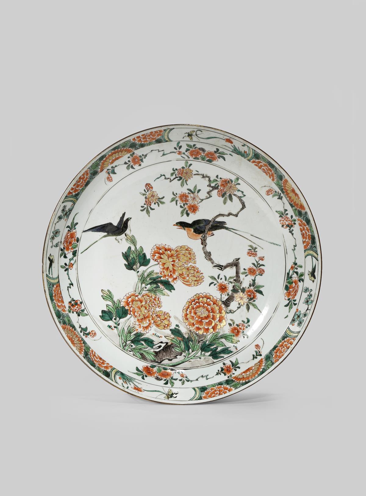 A CHINESE FAMILLE VERTE DISH KANGXI 1662-1722 Painted to the well with a circular panel...