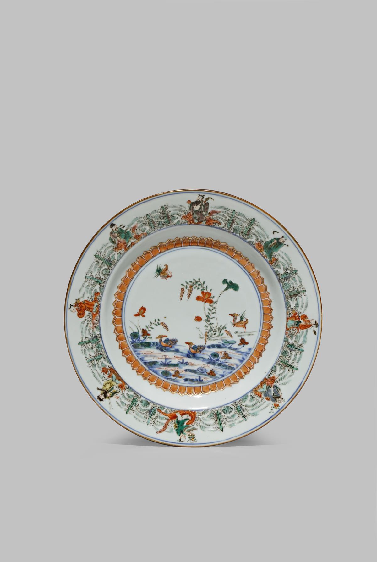 A CHINESE FAMILLE VERTE 'IMMORTALS' PLATE KANGXI 1662-1722 The centre painted with Mandarin ducks...