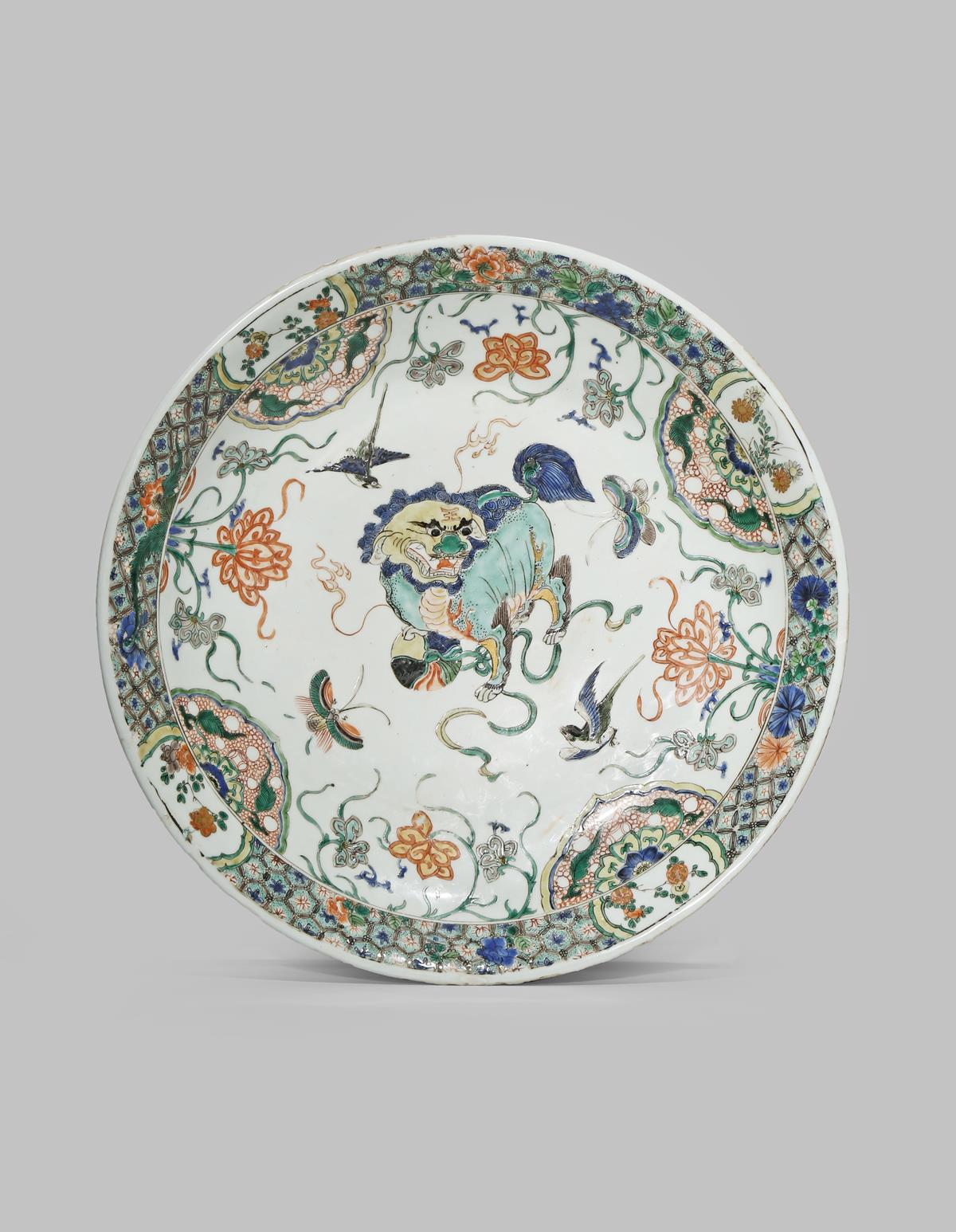 A LARGE CHINESE FAMILLE VERTE DISH KANGXI 1662-1722 Painted to the centre with a Buddhist lion dog