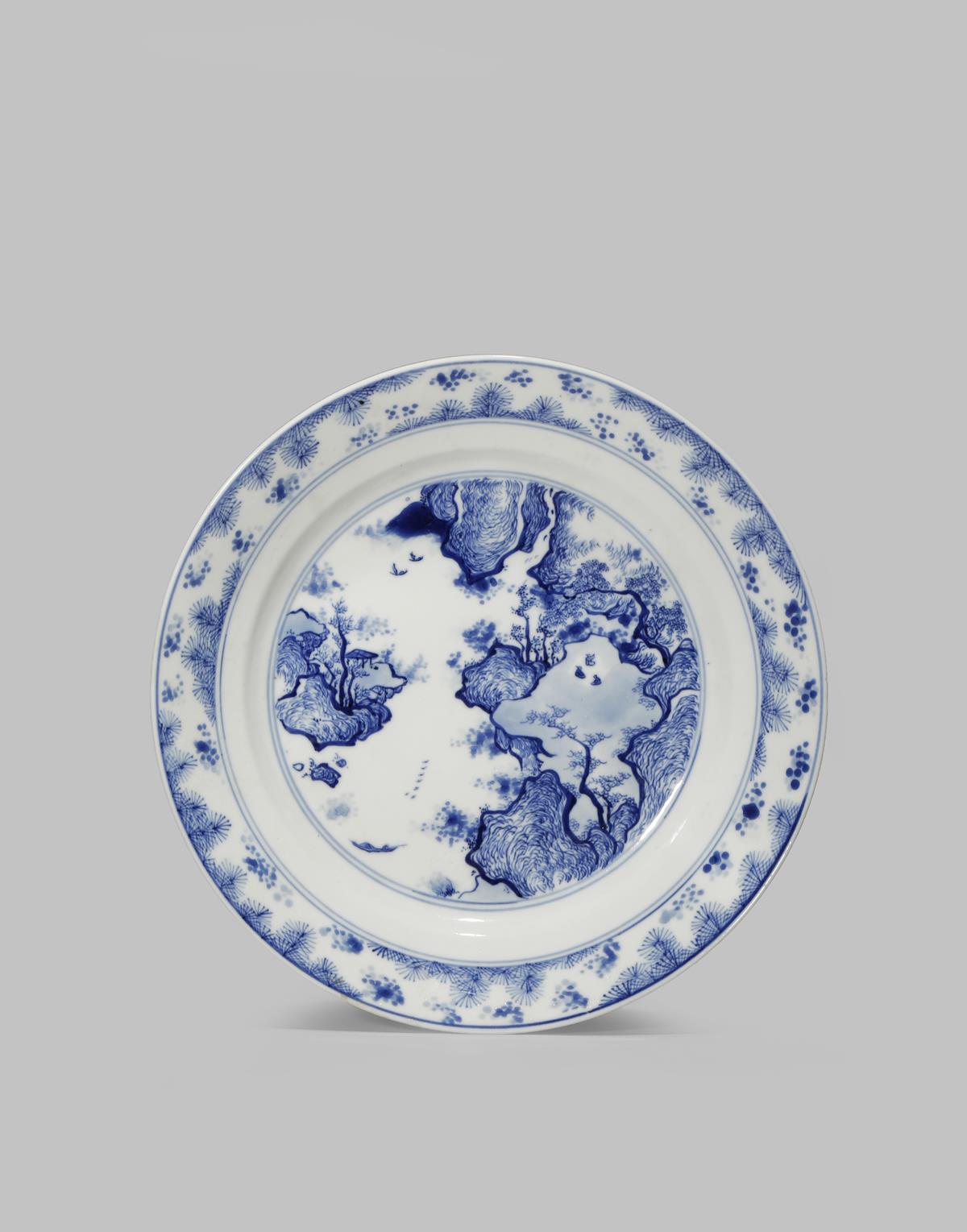 A CHINESE BLUE AND WHITE 'MASTER OF THE ROCKS' PLATE KANGXI 1662-1722 Painted with an extensive...