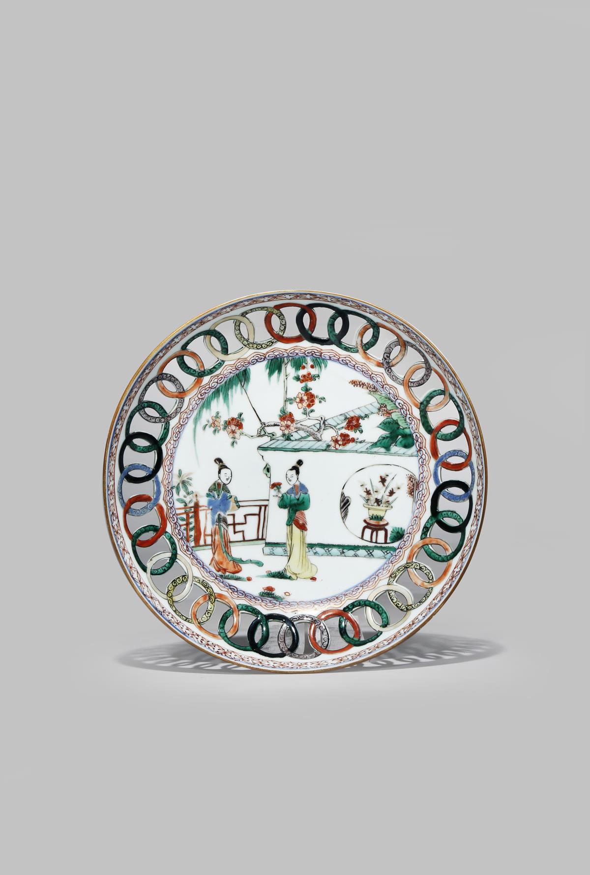 Painted to the centre with two ladies standing in a walled garden, with overhanging willow and prunus, bordered by an openwork cash border, 21.7cm.