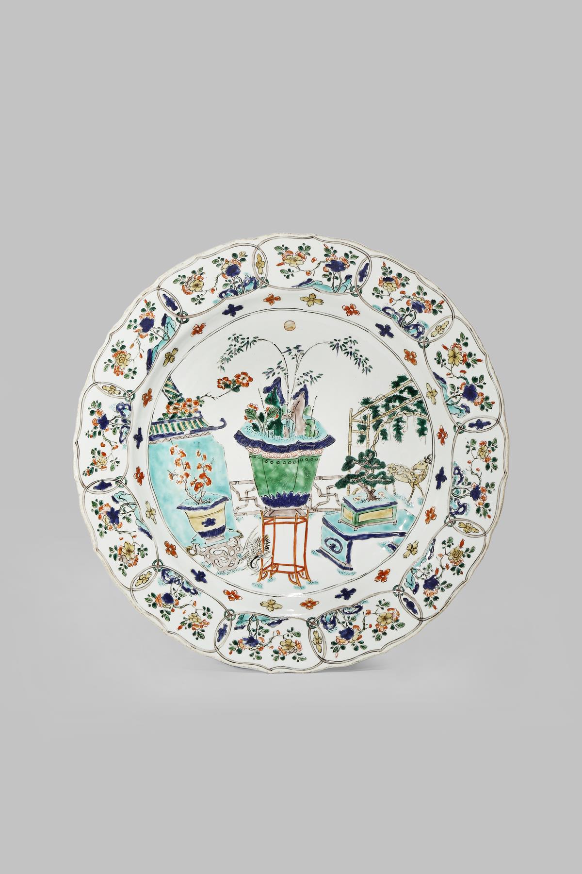 A LARGE CHINESE FAMILLE VERTE DISH KANGXI 1662-1722 Painted to the centre with a garden scene