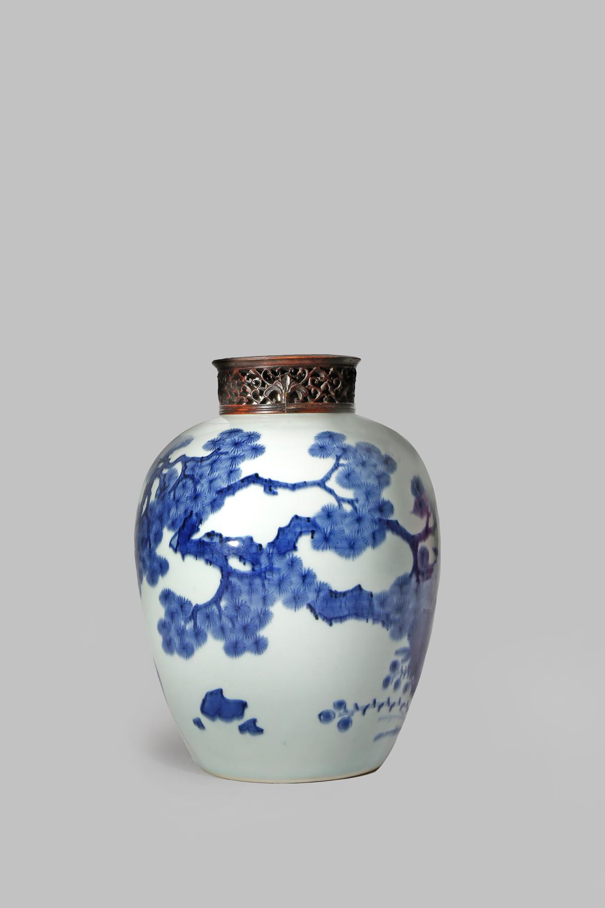 A CHINESE BLUE AND WHITE OVOID VASE C.1640 Painted with the Three Friends of Winter emerging from...