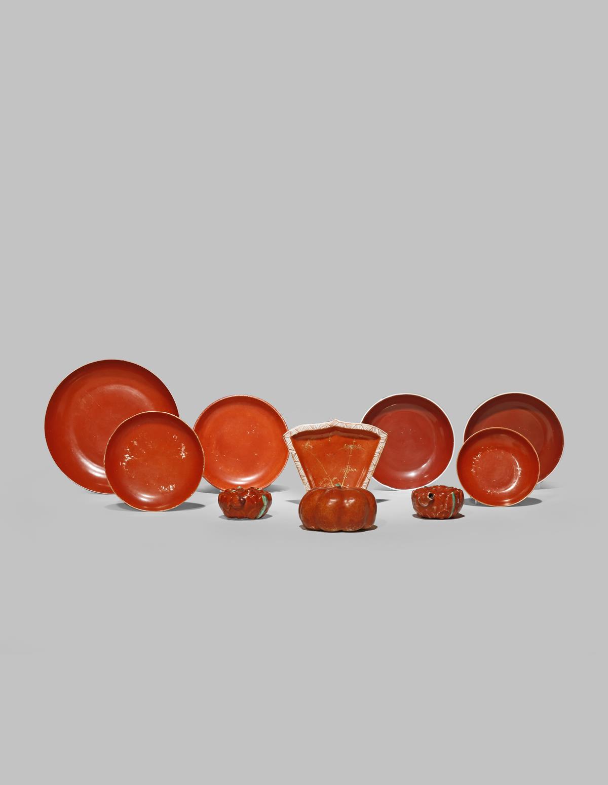 Comprising a pair of water droppers formed as lotus seed pods, a water dropper formed as a gourd, a fan-shaped dish and six circular dishes, the largest with a six character Hongzhi mark, 21.6cm. (10)