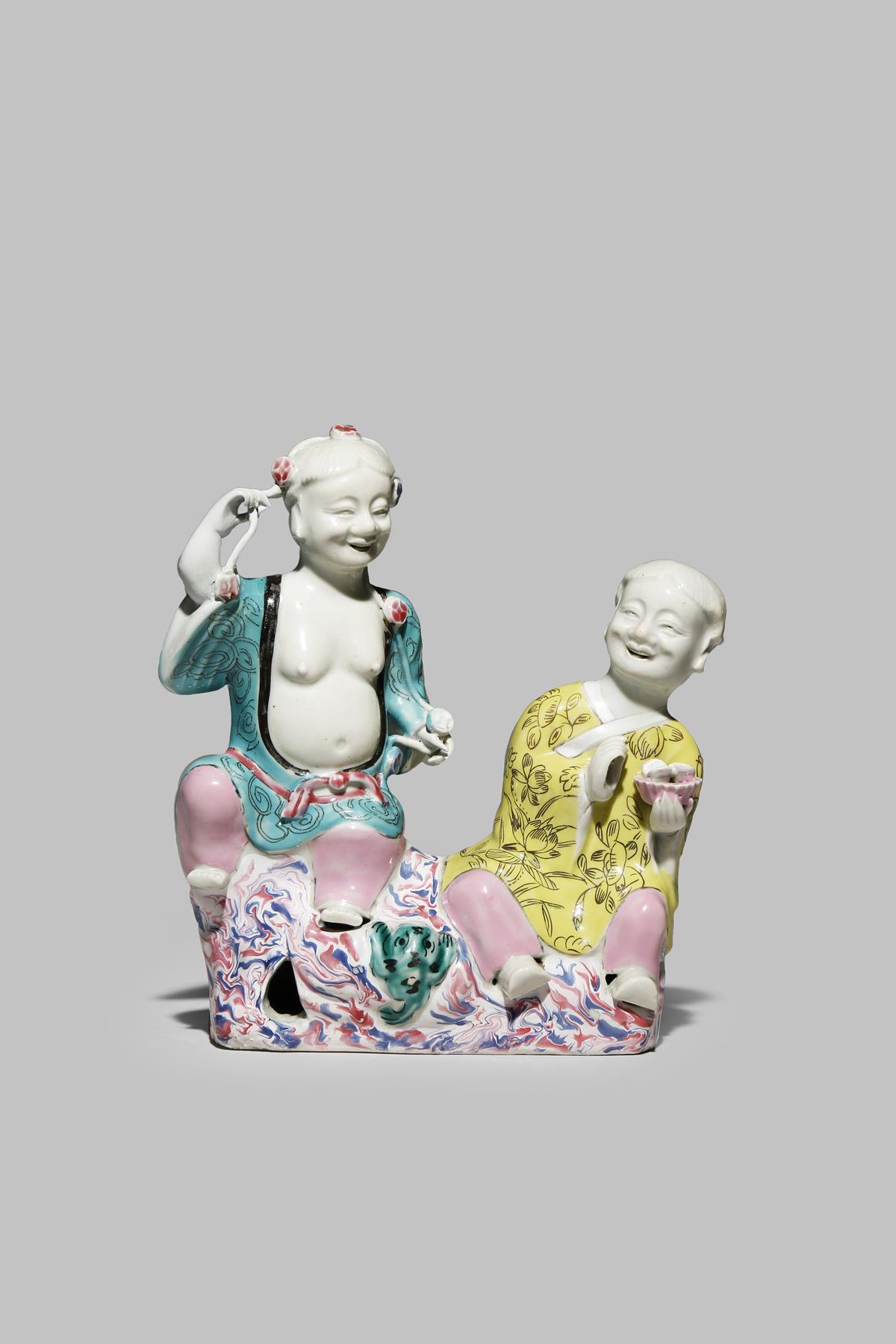 A CHINESE FAMILLE ROSE MODEL OF THE HEHE ERXIAN 18TH CENTURY The twins seated on colourful rockwork
