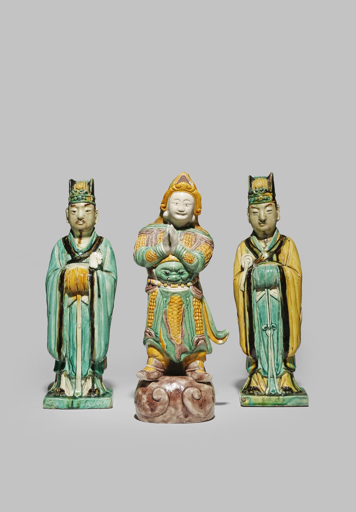 Each standing wearing long flowing robes and a tall hat, and with his hands clasped before him, together with a pottery model of Weituo, standing with his hands raised in prayer, wearing elaborate battle dress, all decorated with green, yellow and aubergine glazes, 34.5cm. (3)