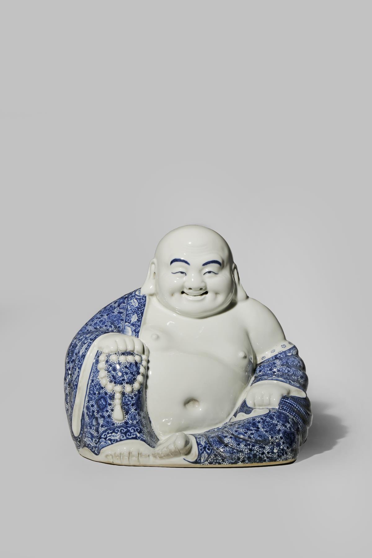A CHINESE BLUE AND WHITE FIGURE OF BUDAI HE SHANG 20TH CENTURY Seated holding a rosary