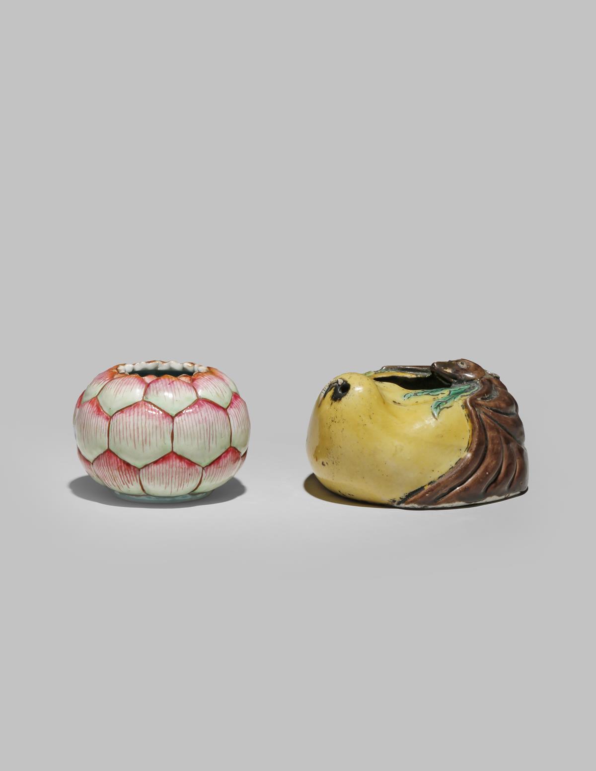 Formed as a lotus flower, with moulded petals radiating from the base, together with a water dropper formed as a gourd with a bat clambering to one corner, 10.3cm. (2)