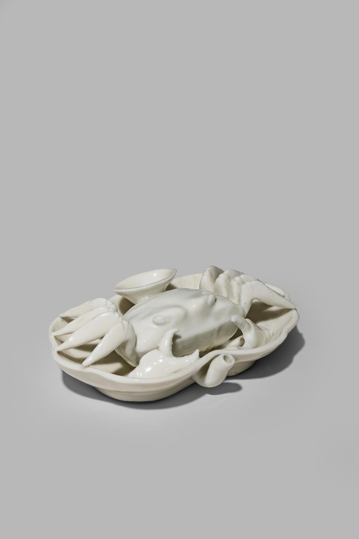 A CHINESE BLANC DE CHINE WATER DROPPER 17TH CENTURY Formed as a crab crouching on a large lotus leaf