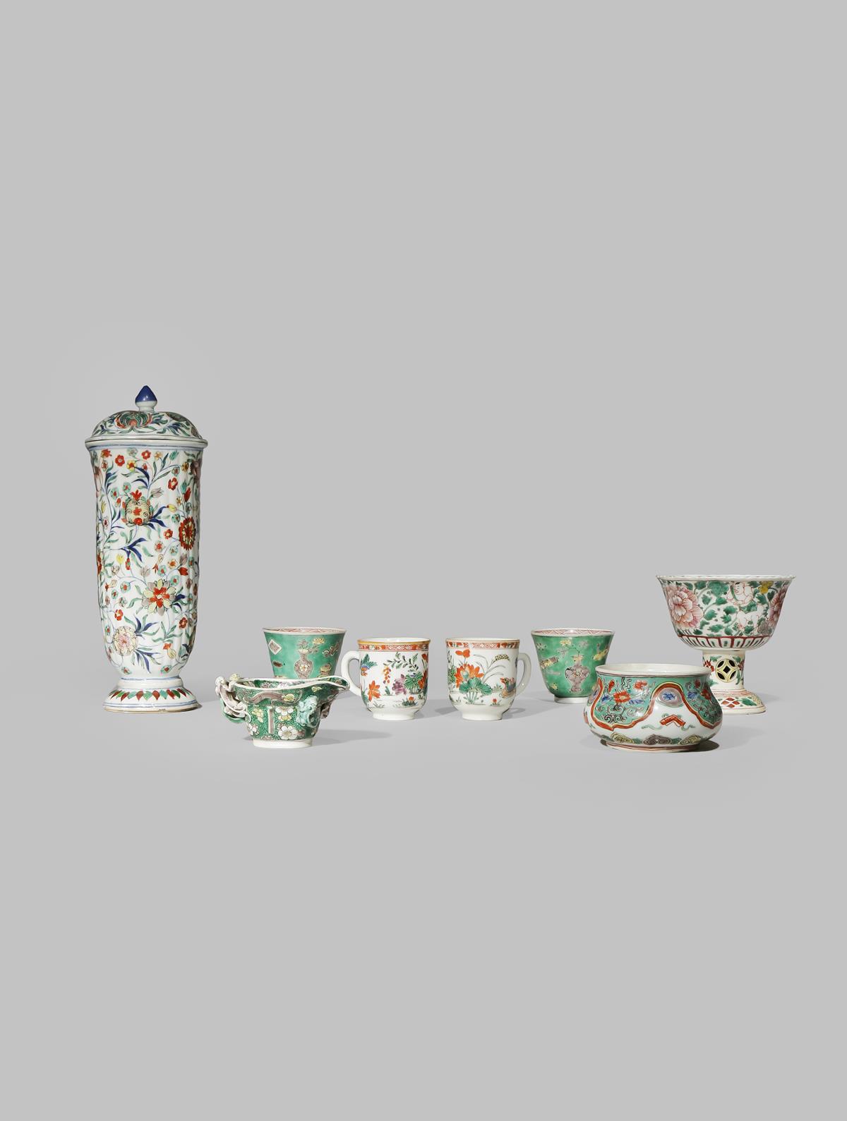 EIGHT CHINESE FAMILLE VERTE ITEMS KANGXI 1662-1722 Comprising a pair of tea bowls