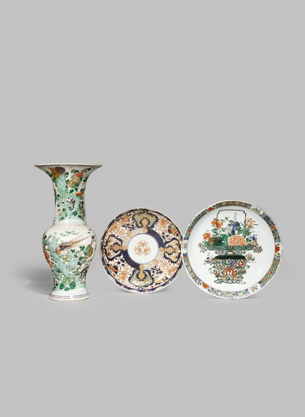 Painted with a pheasant, rockwork and flowers, together with a famille verte and a Japanese Imari dish, both early 18th century, 46cm. (3)