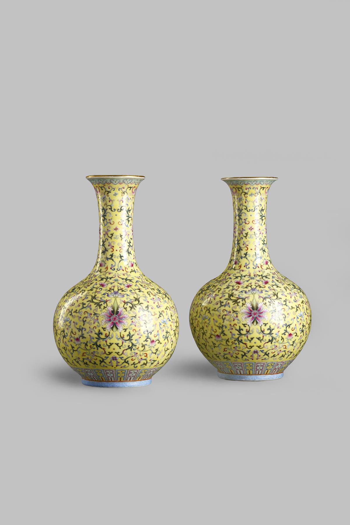 A PAIR OF CHINESE FAMILLE ROSE BOTTLE VASES 19TH CENTURY Each decorated with a stylized lotus scroll