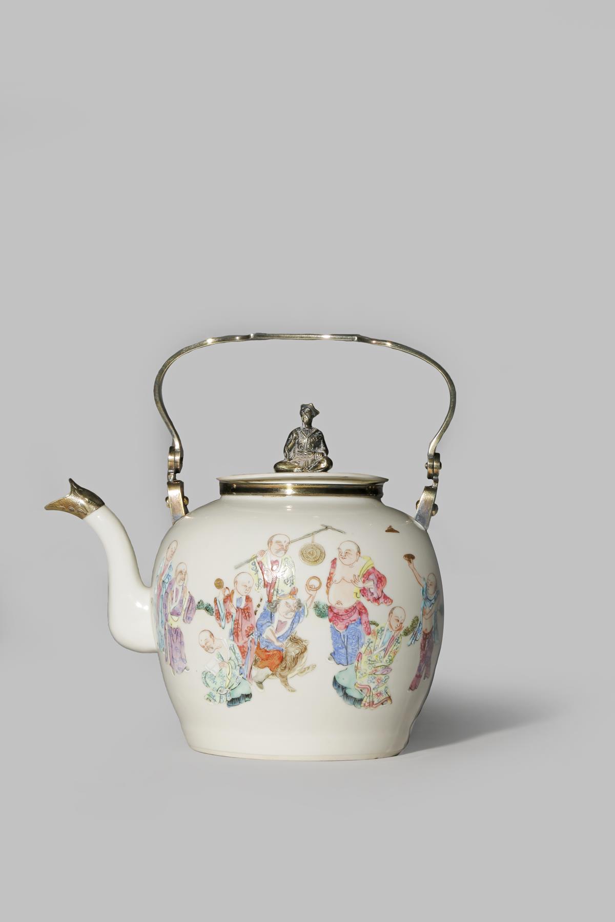 Painted with the eighteen arhats holding their attributes, a small dragon emerging from clouds above, the spout, rim and handle in white metal decorated with scrolls and with imitation punch marks, the cover surmounted by a seated man, 16cm. (2)