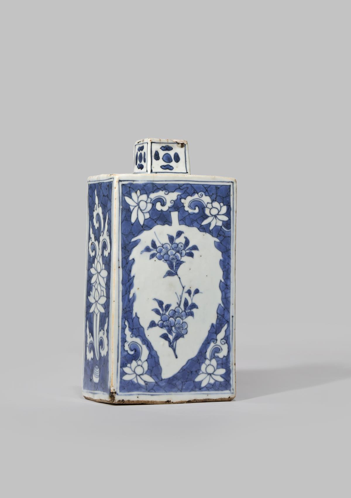 A CHINESE BLUE AND WHITE RECTANGULAR FLASK 18TH CENTURY Painted to each side with an...