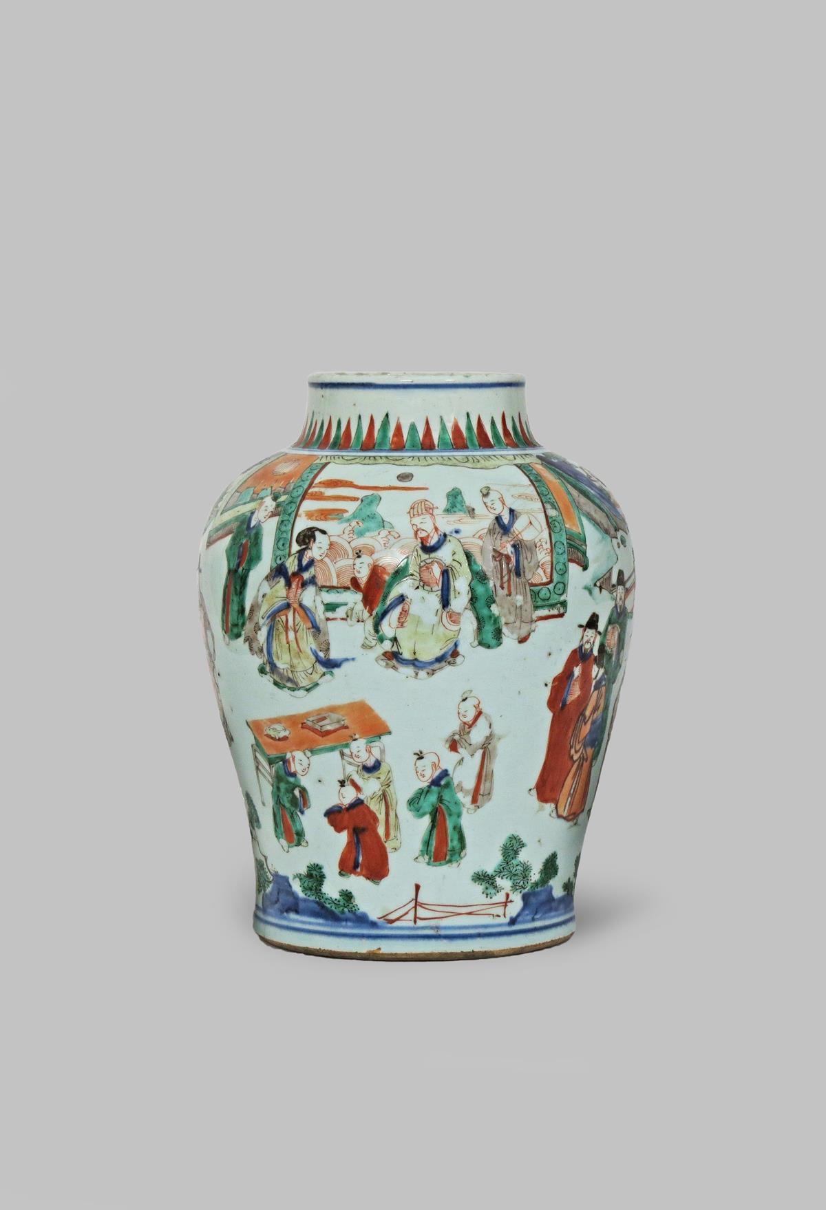 A CHINESE WUCAI VASE 17TH CENTURY Painted with many figures in a garden amongst clouds