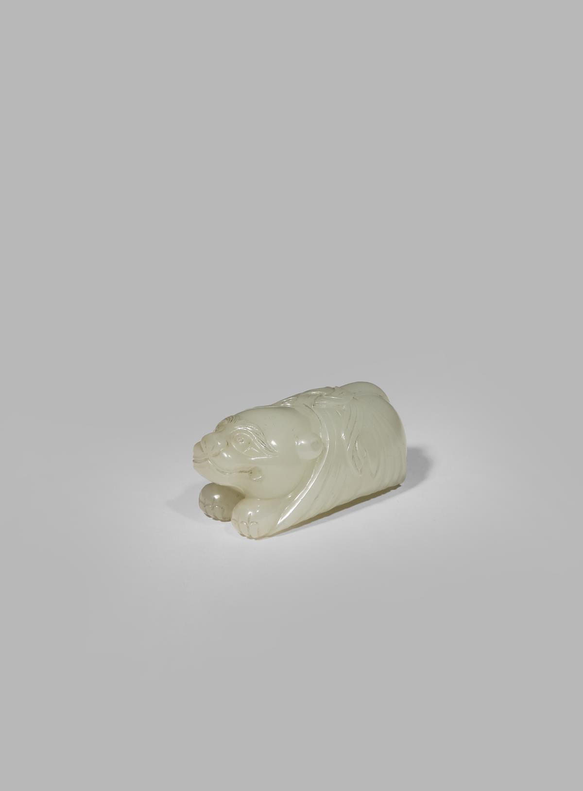 A SMALL CHINESE CELADON JADE CARVING OF A TIGER QING DYNASTY OR LATER Crouching and wrapped in a...