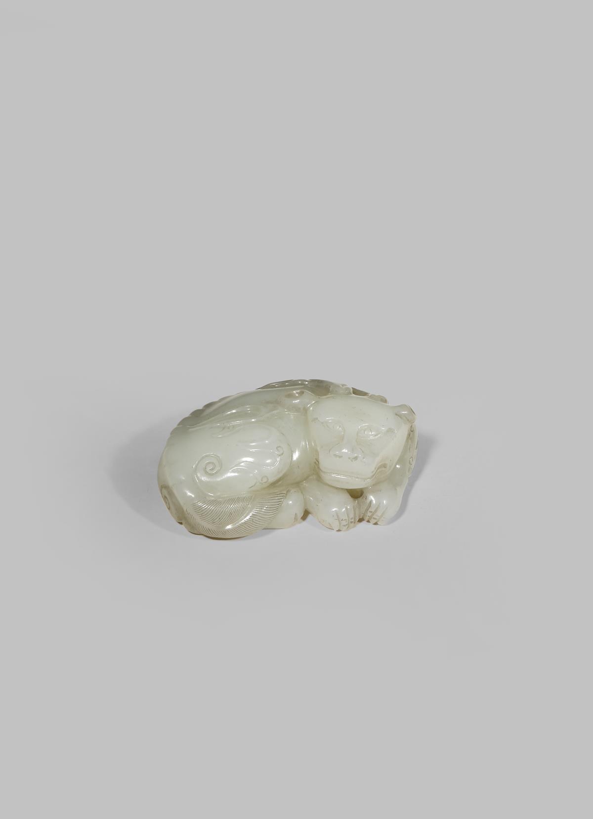 A CHINESE WHITE JADE CARVING OF A MYTHICAL CREATURE QING DYNASTY OR LATER Recumbent and curled...