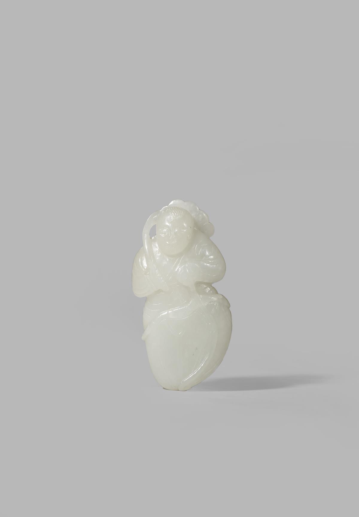 A CHINESE PALE CELADON JADE CARVING OF A BOY 18TH/19TH CENTURY Standing in a large upturned lotus...